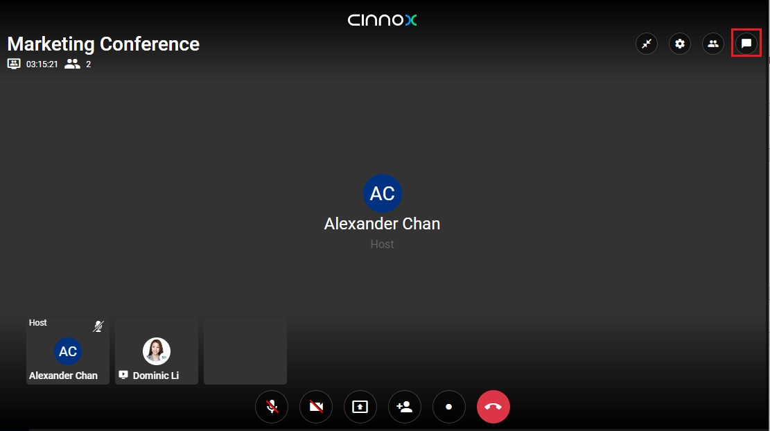 To send a message or share a media file with all participants, click the Chat icon at the top right corner of the conference call window.