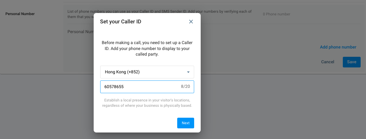 CINNOX lets you add your phone number as your Caller ID (CLI) and SMS Sender ID when making outbound calls and sending SMS texts to visitors, customers, and colleagues. This way, your customers and colleagues can recognise you with your CLI and SMS Sender ID, regardless of your physical location.