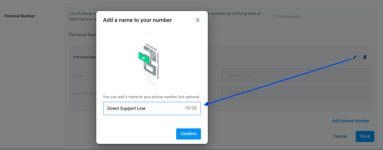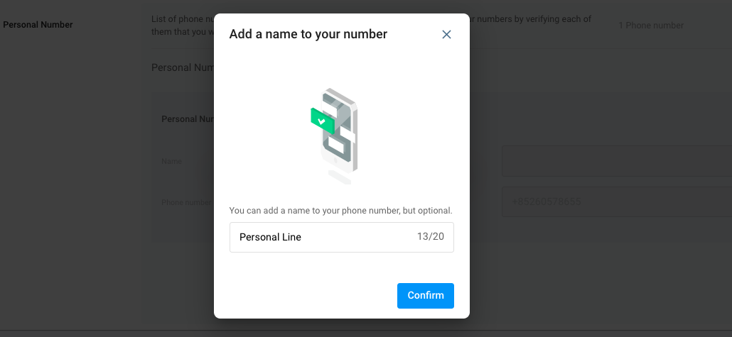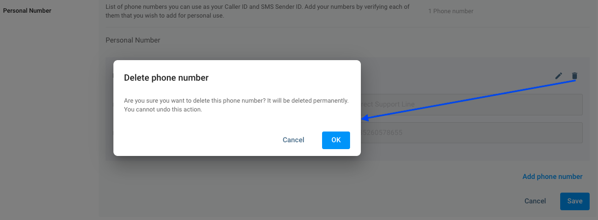 On the Personal Number section, click the trash icon beside the phone number you wish to delete. A pop-up message will then appear, asking you to confirm the action.