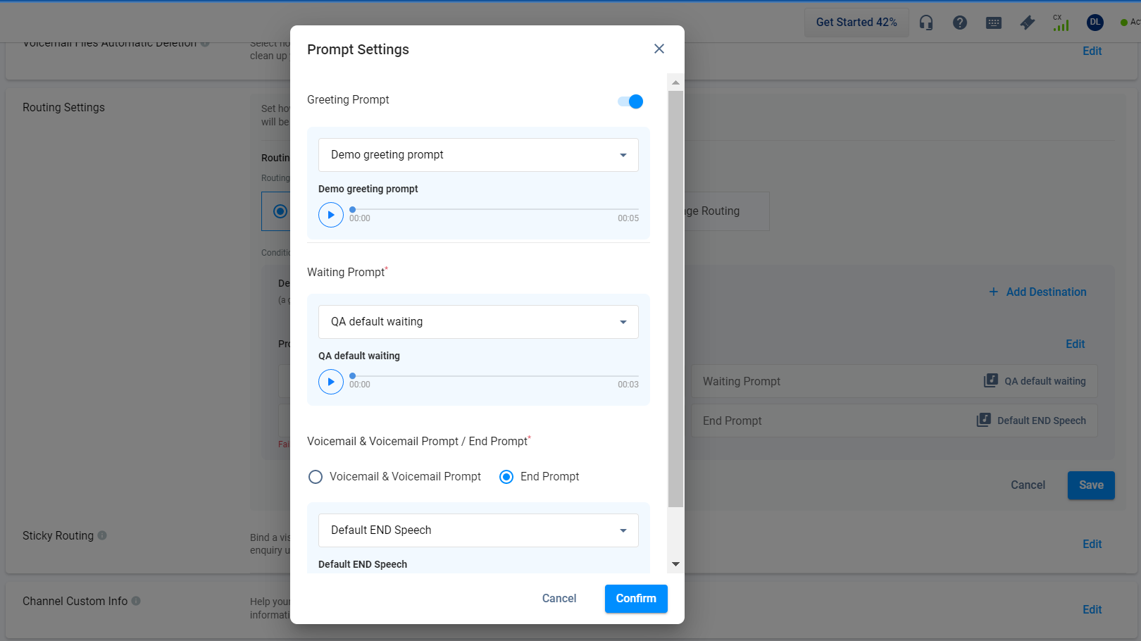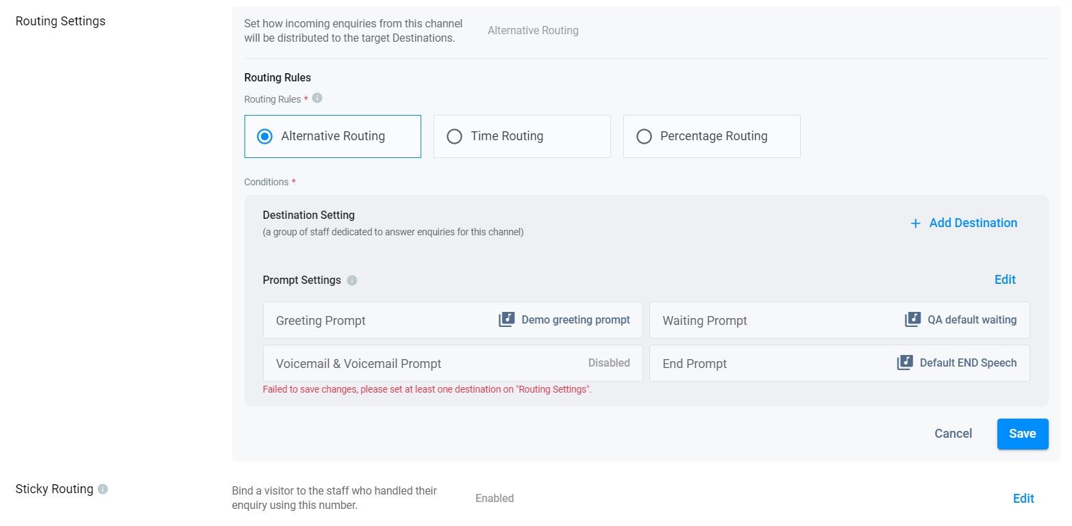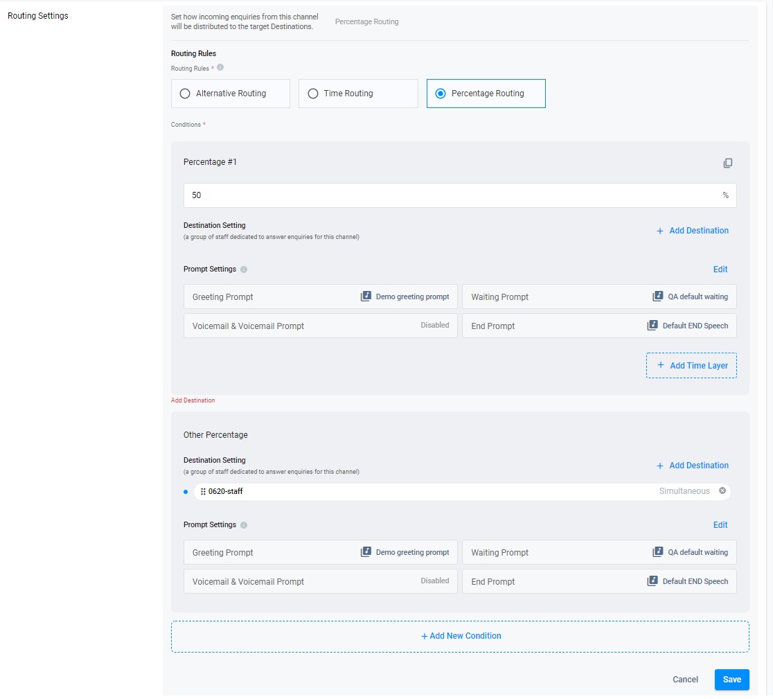 In tandem with the defined routing rules, namely, Alternative Routing, Time Routing and Percentage Routing, add prompts for different call stages, bringing your customers and visitors a more personalised and interactive call experience.