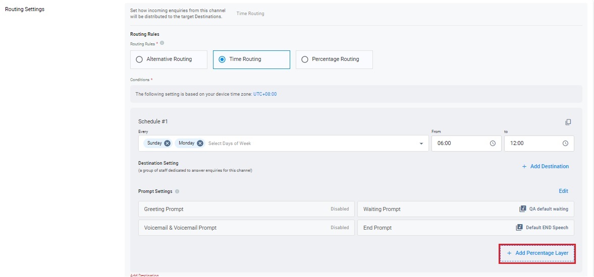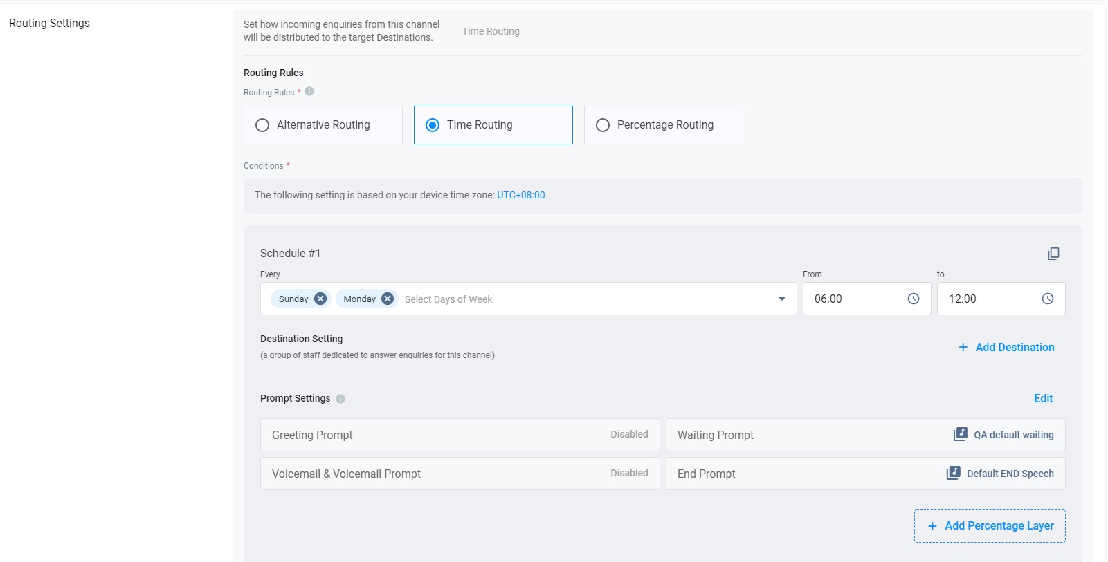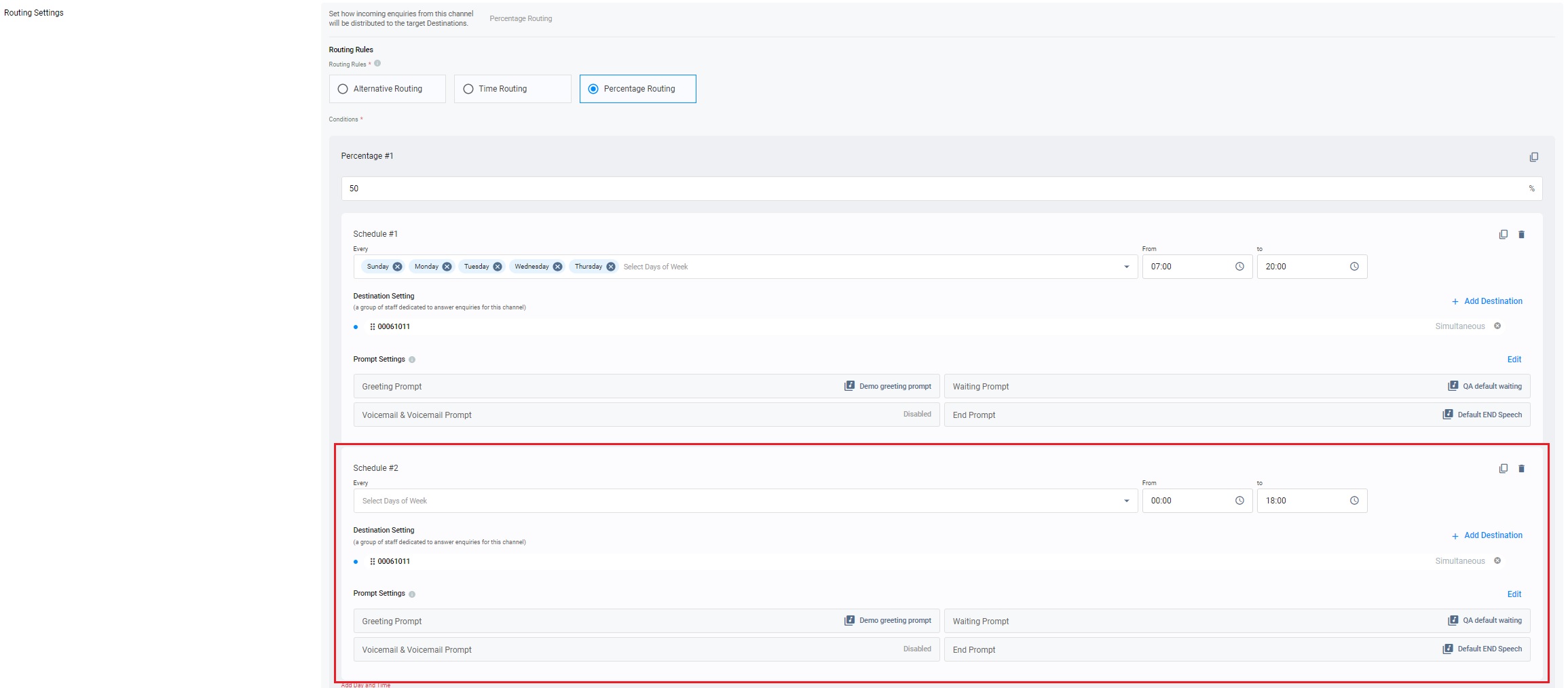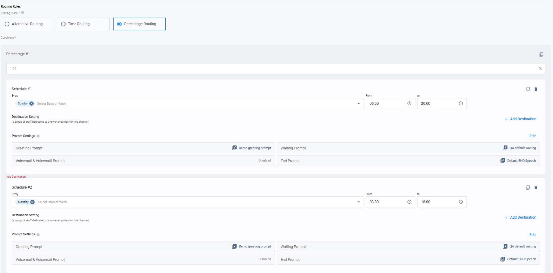 - If the percentage of the Percentage #1 setting is deleted, Time Zone #1 will inherit the Destination Setting and Prompt Setting, originating from the Percentage #1 setting.