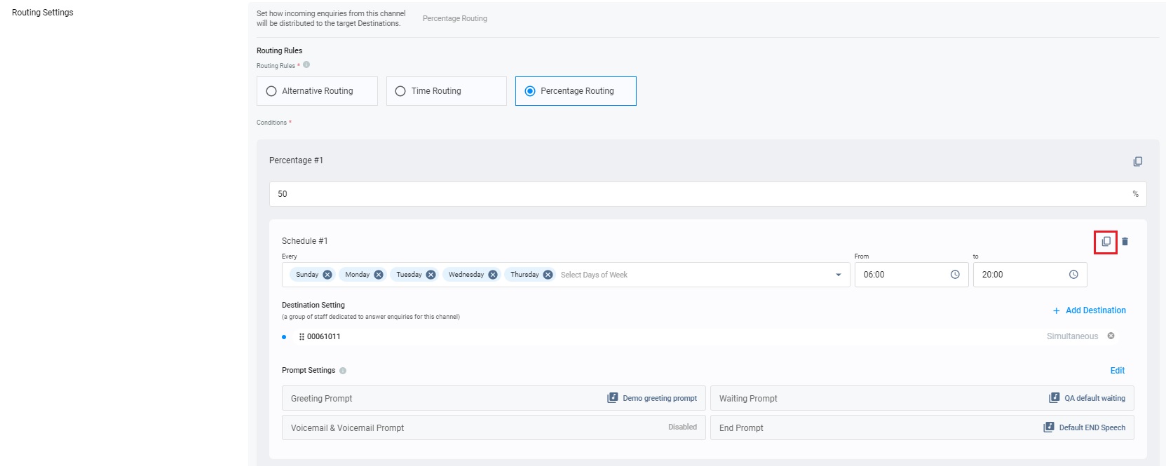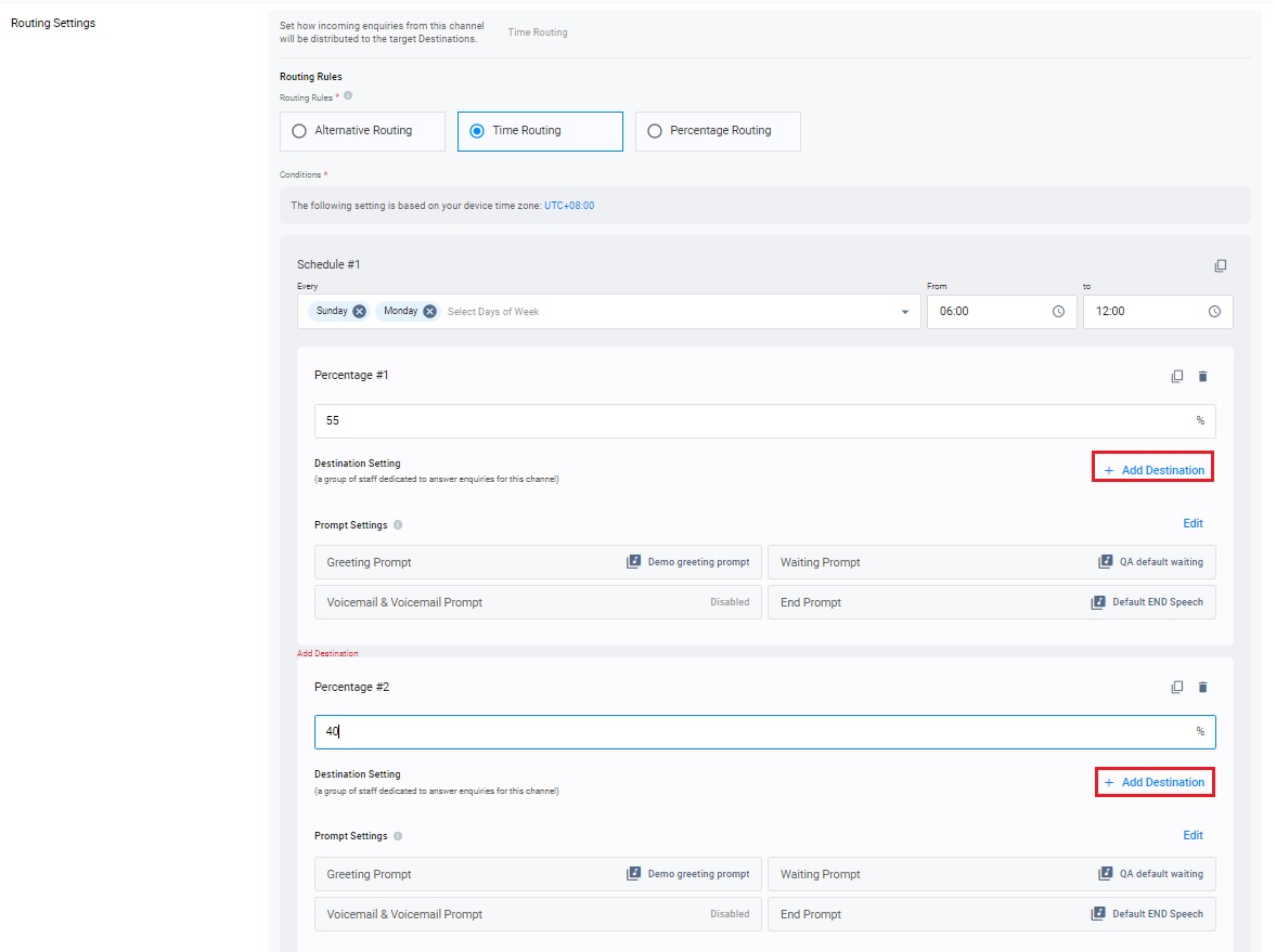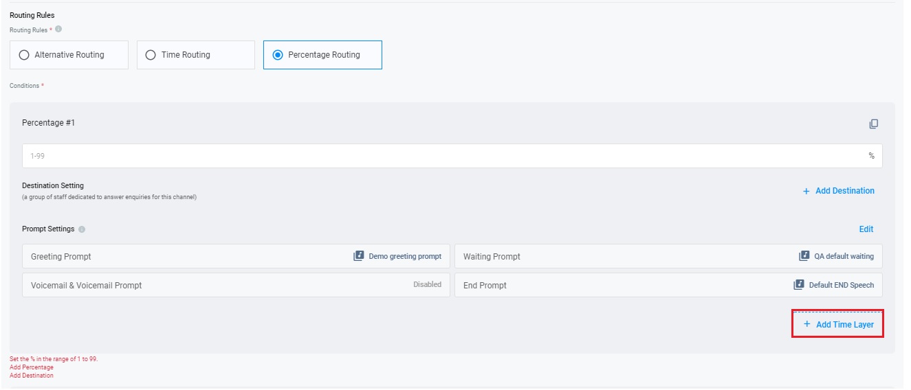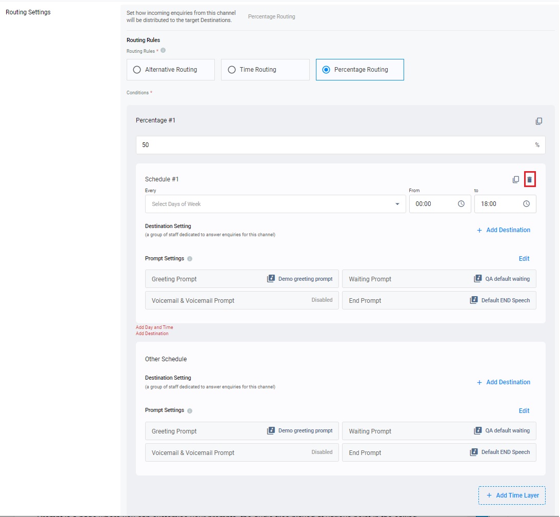 - If the percentage of the Percentage #1 setting is deleted, Time Zone #1 will inherit the Destination Setting and Prompt Setting, originating from the Percentage #1 setting.