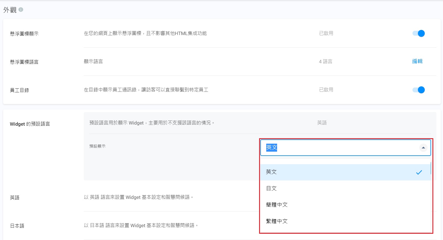- 在Widget 的預設語言,選擇顯示 Widget的預設語言,主要用於不支援該語言的情況。