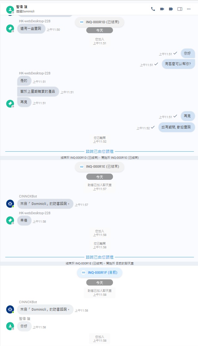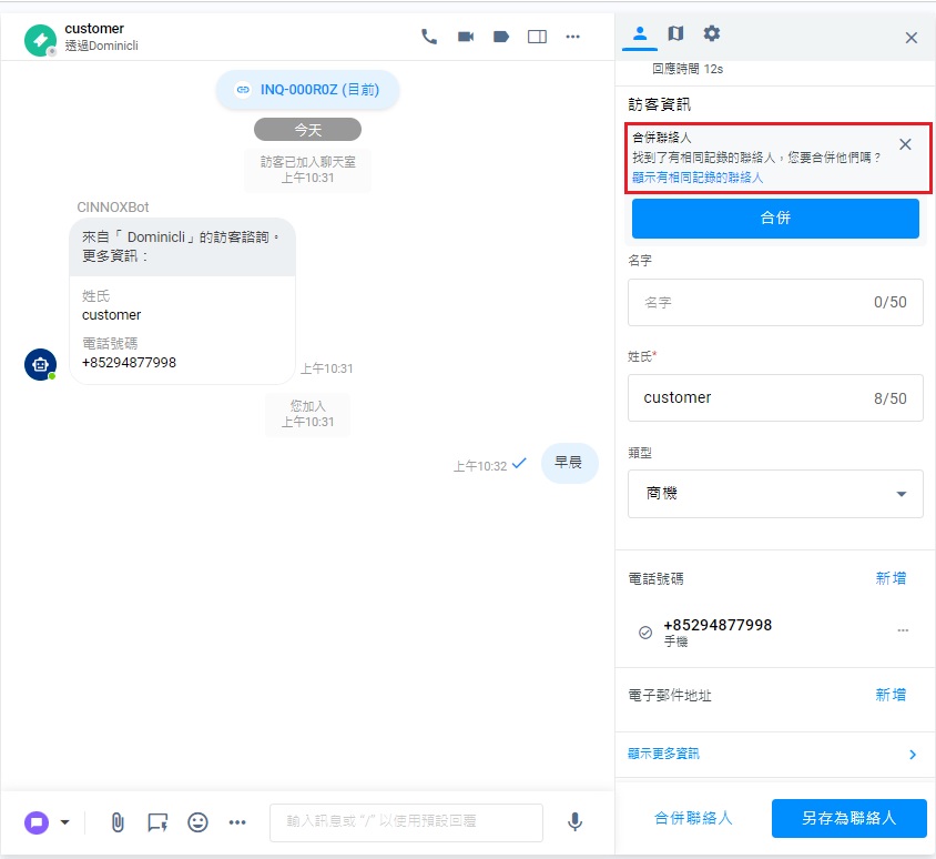 假如有多個已結束和處理中諮詢的聯絡人,其資料合併到另一個聯絡人的資料後,兩者的諮詢會合併,可在同一個聊天室查看。