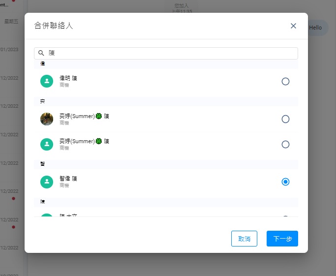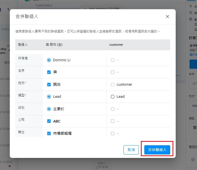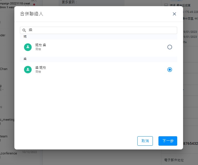 聯絡人資料合併後,所有活動和聊天室會被合併,並可在合併後的聯絡人中查看。