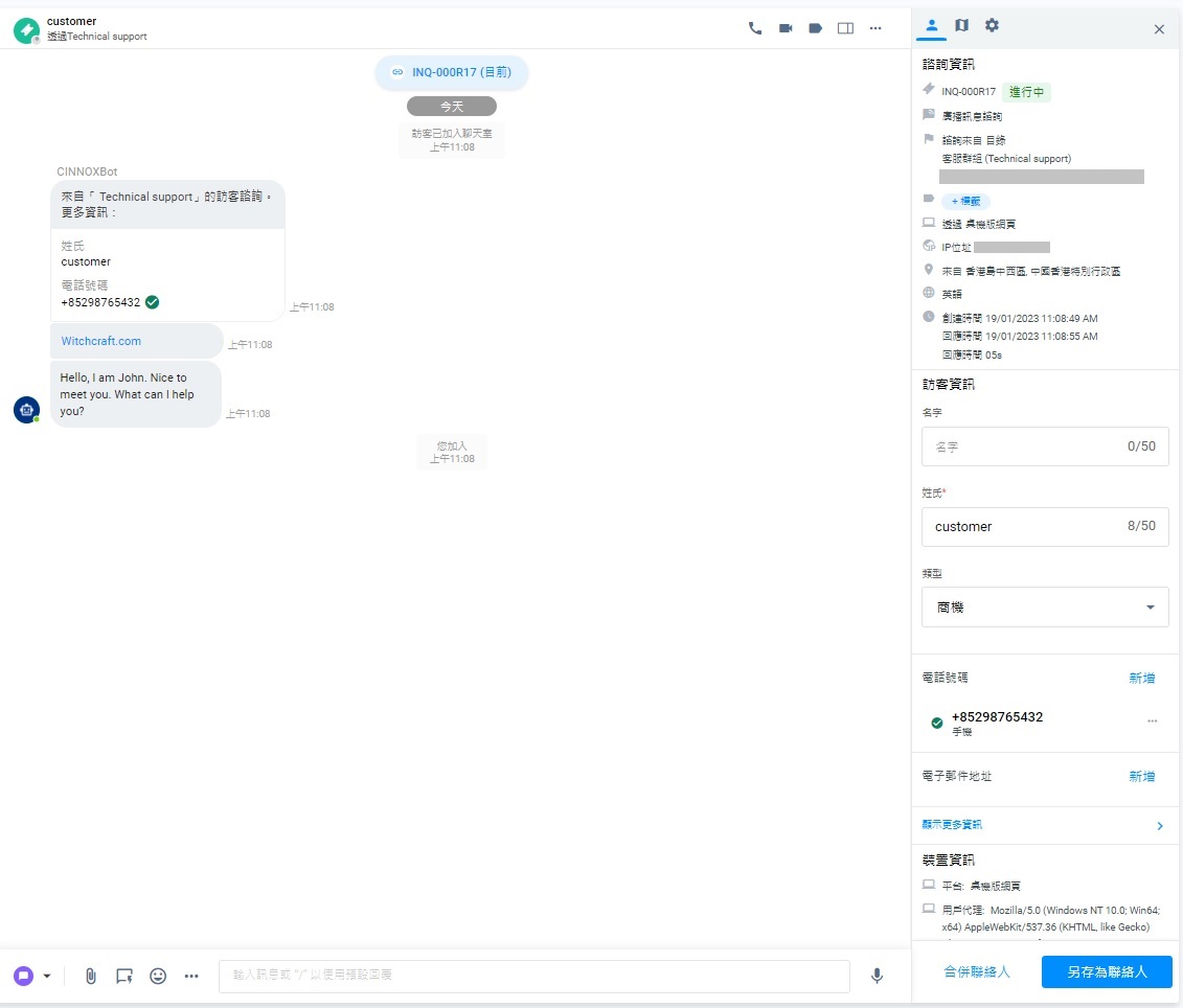 假如經驗證電話號碼的訪客,其電話號碼亦早已儲存在通訊錄內,系統會在諮詢聊天室的面板上作以下建議: