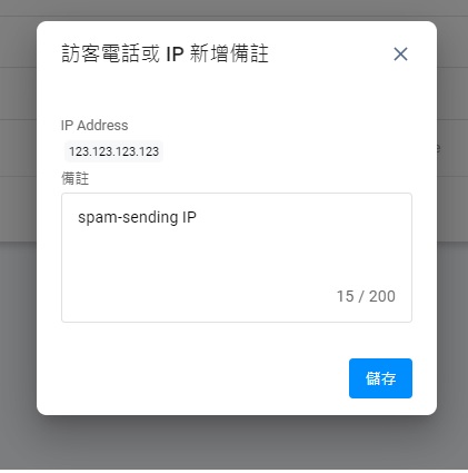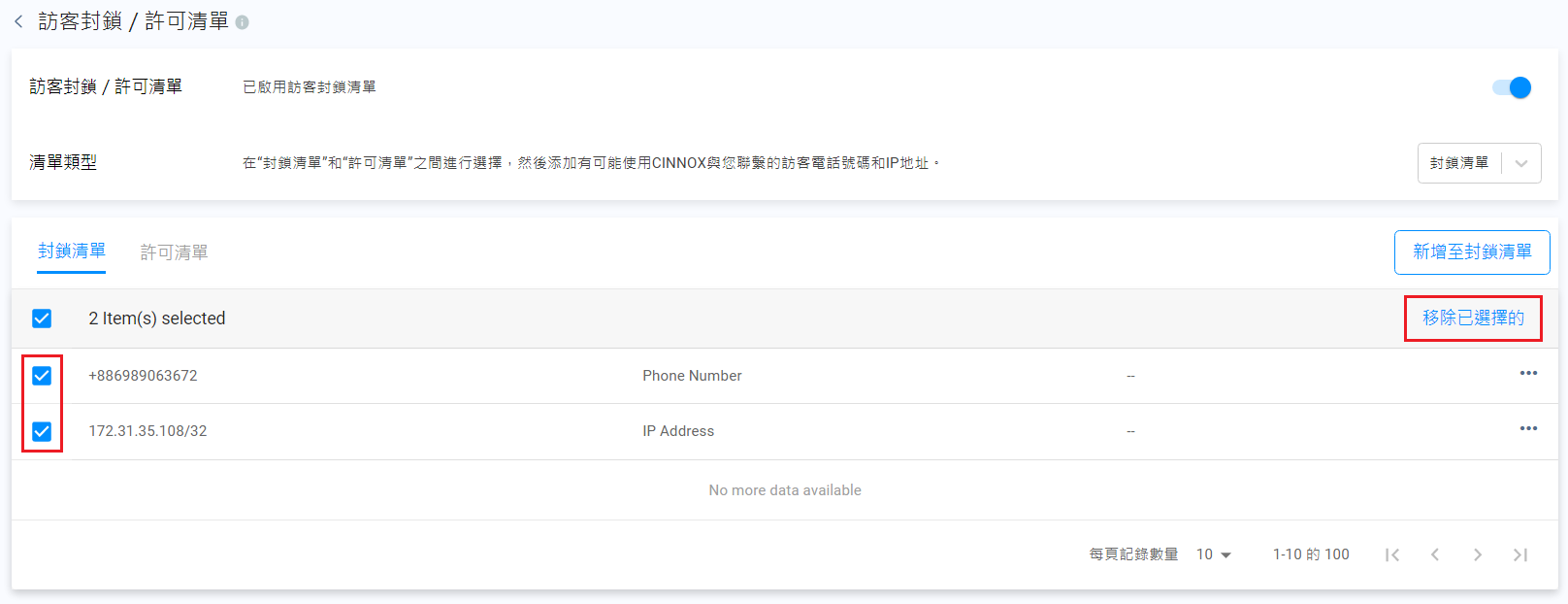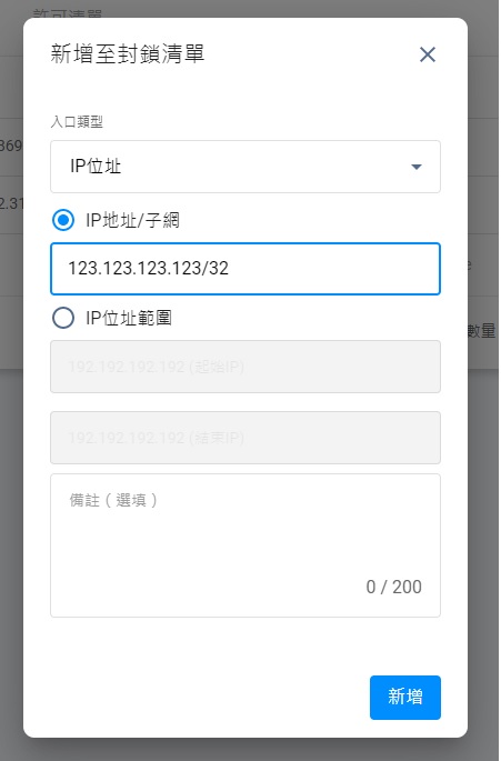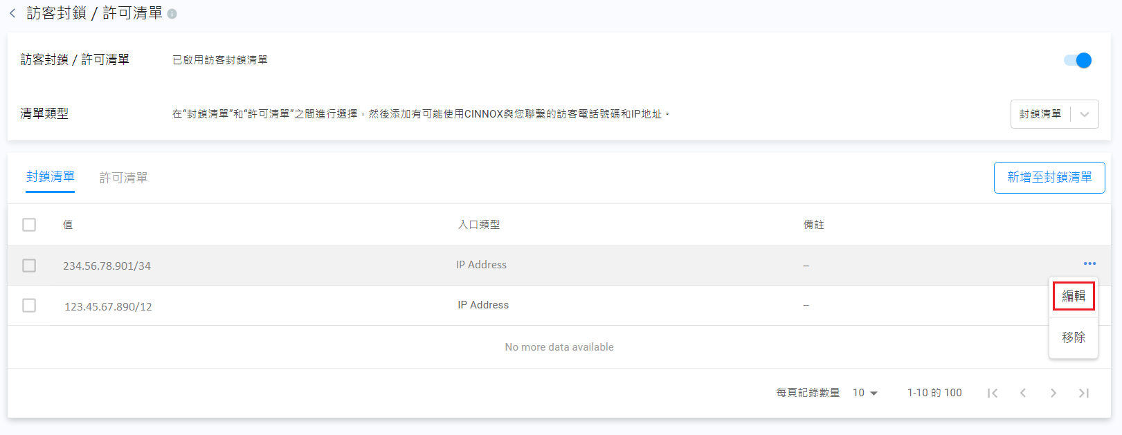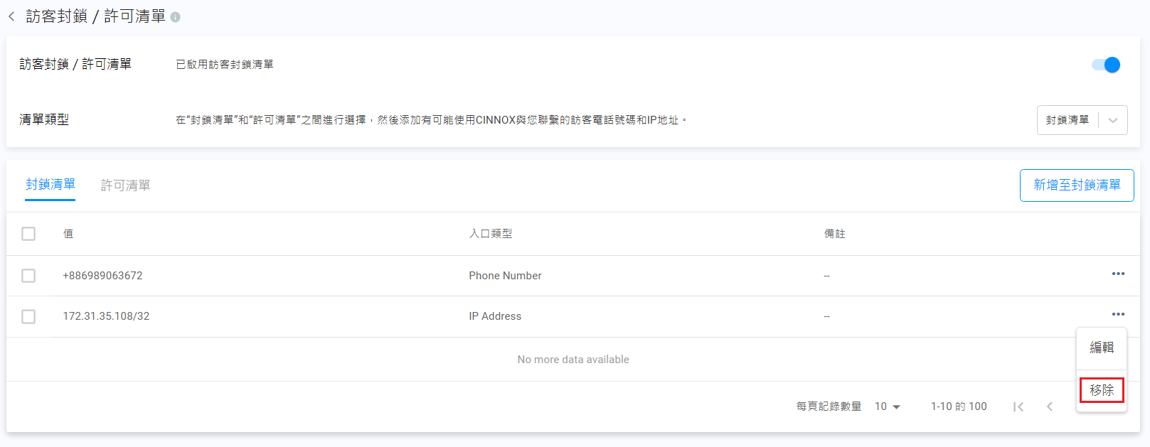 你可以將訪客電話號碼和IP地址,加到封鎖清單或許可清單。 這些加入的條目,可以只是值,或是值的範圍。